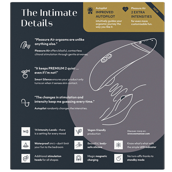 従来までのウーマナイザーと比べ、新機能を搭載したワンランク上の「ウーマナイザー プレミアム2 (ブラック)」が登場しました。 吸引部分にはタッチセンサーが搭載され、ボタンを押さなくてもお肌に当てるだけで吸引♪離すだけで振動が停止。 これまでのようにボタン操作の煩わしさがなくなり、より快適に楽しめるようになりました!さらに新機能のパイロットコントロールによりボタン操作をしなくても吸引の強弱を自動でコントロール。 弱・中・強の3段階のレベルからセレクトでき、毎回予測できないユニークな振動が味わえます!従来品と比べて吸引振動強弱は14段階に、パイロットモード搭載(強弱3段階)、素材はシリコン/ABS樹脂で2時間のフル充電で連続4時間の使用が可能です。