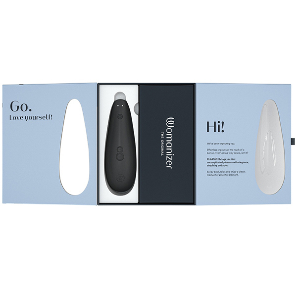 従来のバイブとは違い、クリトリスを吸うことを目的とした人気のトーイ・ウーマナイザーから入門用が登場!その名も「ウーマナイザー クラシック2 (ブラック)」。 プレミアムほどの高性能は要らない、でも高級感は失いたくない!そういう人のために登場したのが本作です。 これから初めてのウーマナイザーを楽しむのに最適!吸引部は柔らかな肌触りの良いシリコンとなり、吸引強弱も8から10段階へ。 オーガズムに達したときに電源ボタンを押すことで最弱の吸引力になる「アフタグローフューチャー」という新機能も搭載♪これによりイッたあともいきなりブツッと切れることなくゆったりとした余韻を楽しむことができます。